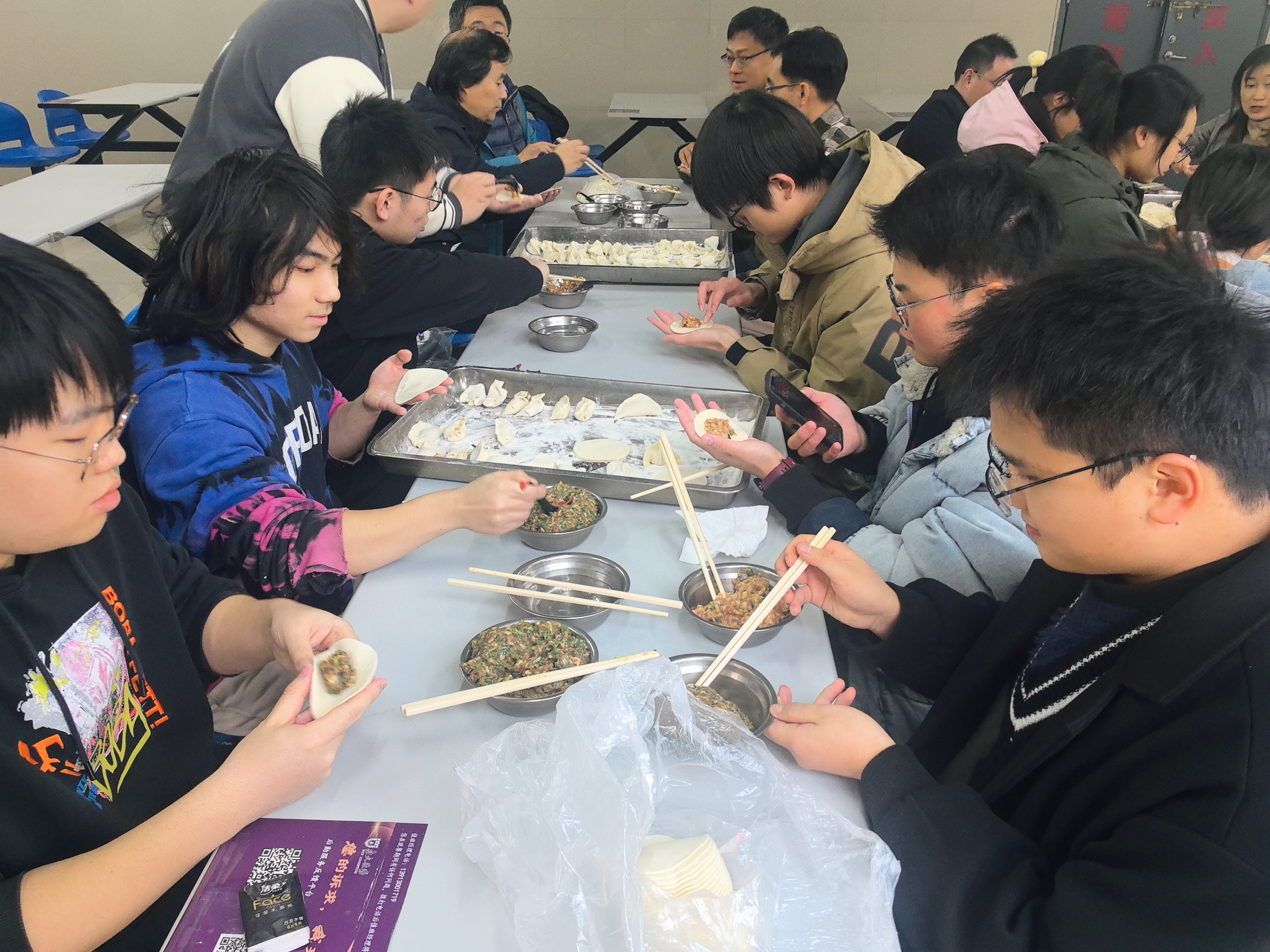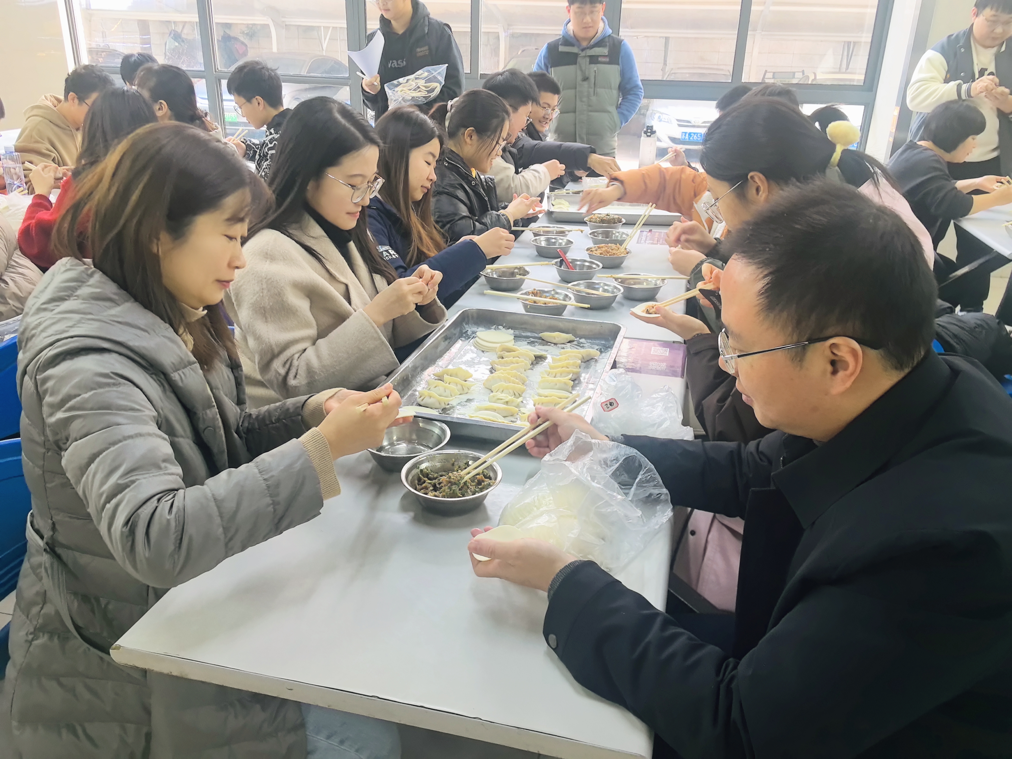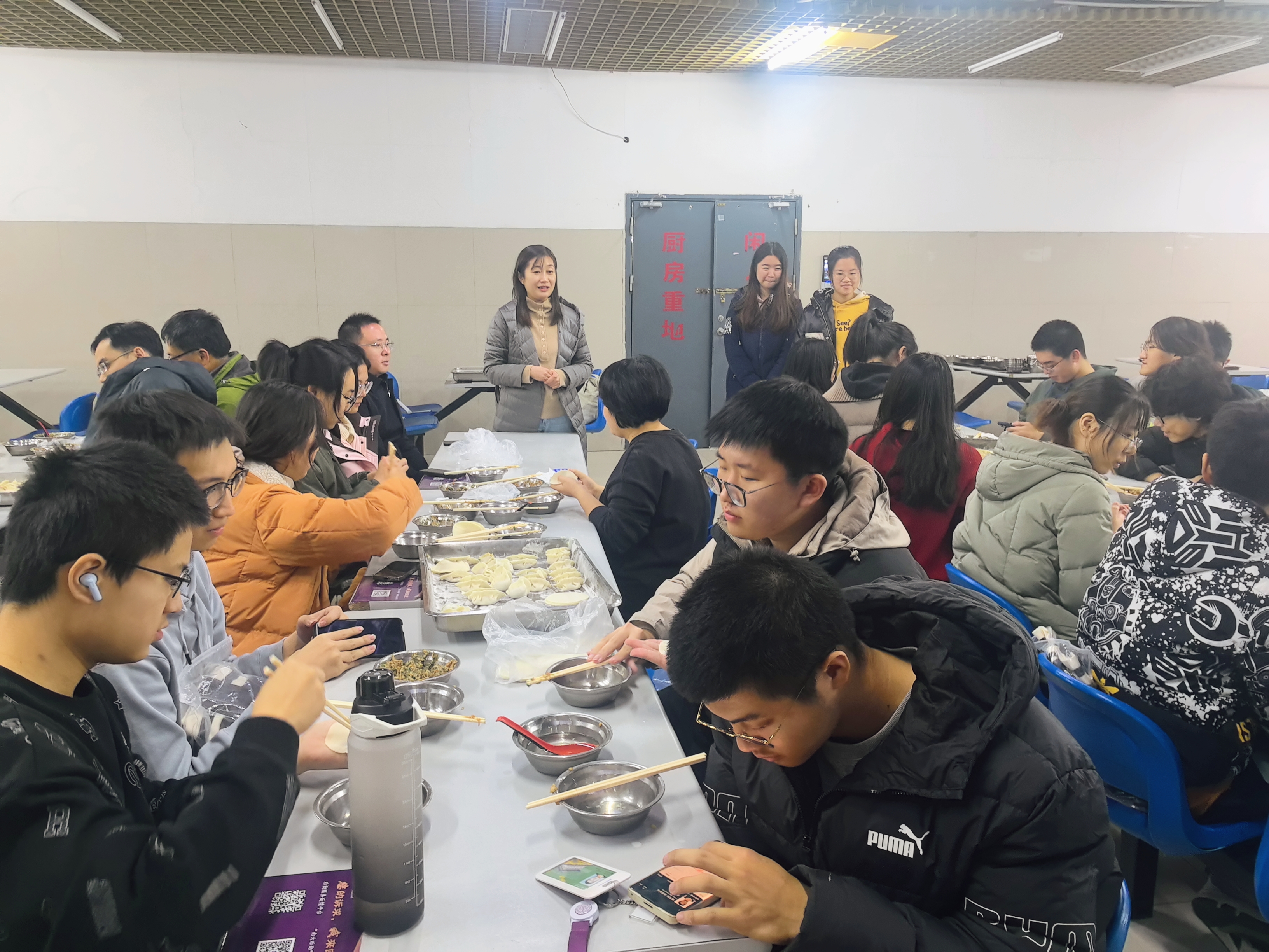 活动中,师生们齐聚一堂,热情高涨,现场欢声笑语不断,分享着家乡习俗和生活趣事。周媛亲自给围坐桌前的同学们现场示范包饺子的经验和技巧,从经验丰富的包饺子高手老师到首次尝试的同学,来自不同地域的大家各显身手。一双双灵巧的手,将一个个饺子赋予了生命,有的圆润饱满,有的创意十足,形态各异,尽显同学们的心灵手巧。