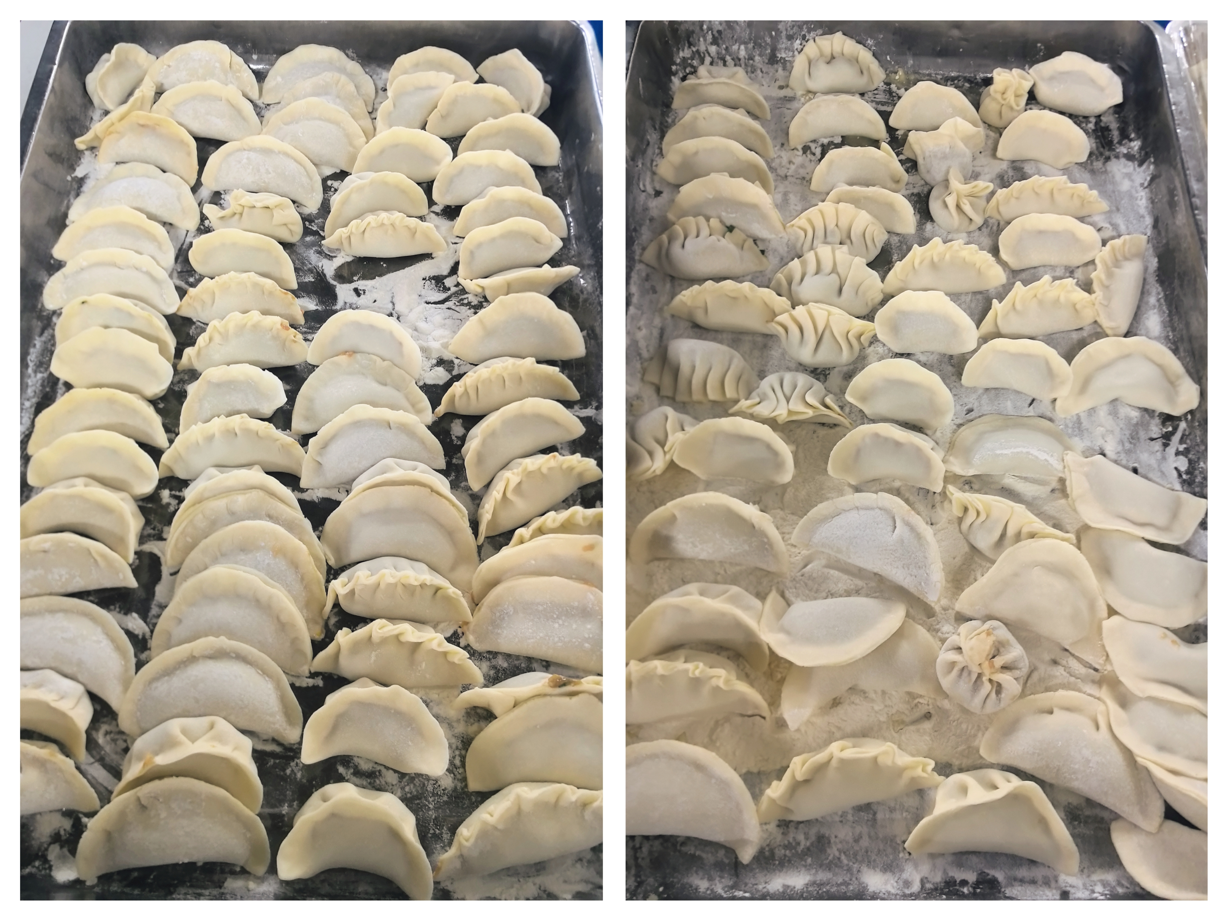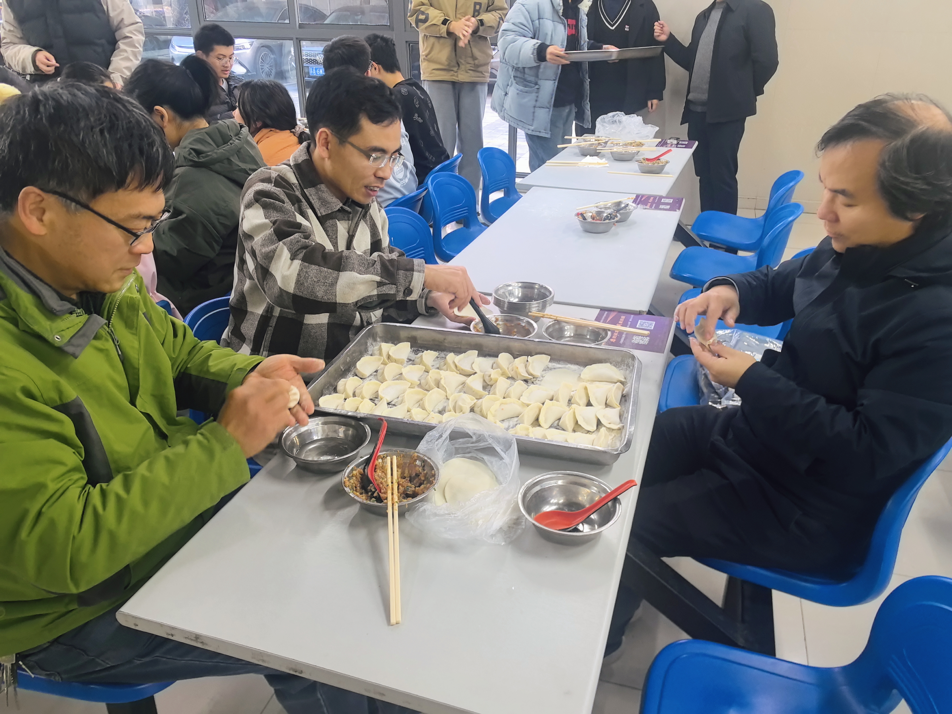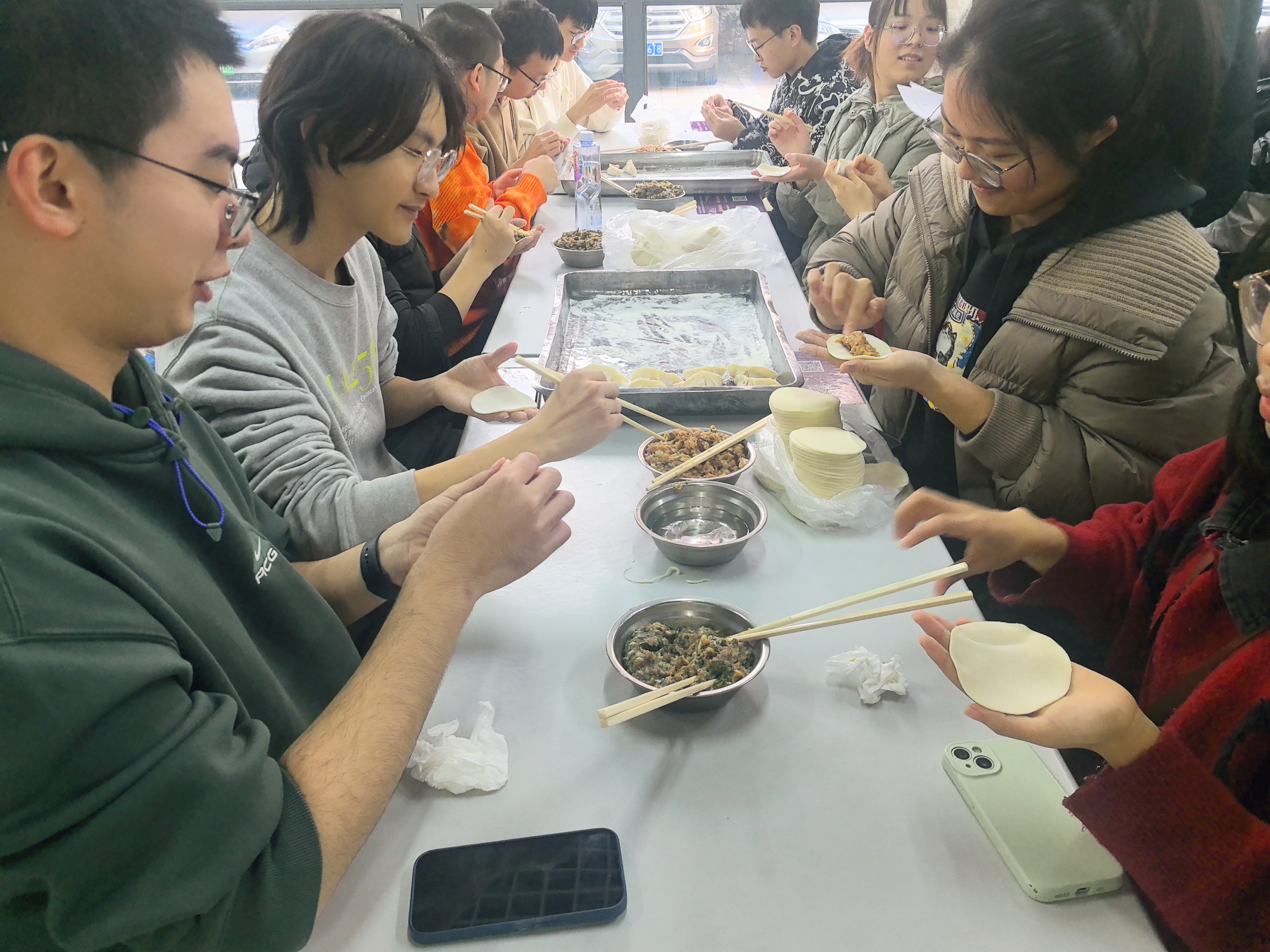 活动中,师生们齐聚一堂,热情高涨,现场欢声笑语不断,分享着家乡习俗和生活趣事。周媛亲自给围坐桌前的同学们现场示范包饺子的经验和技巧,从经验丰富的包饺子高手老师到首次尝试的同学,来自不同地域的大家各显身手。一双双灵巧的手,将一个个饺子赋予了生命,有的圆润饱满,有的创意十足,形态各异,尽显同学们的心灵手巧。