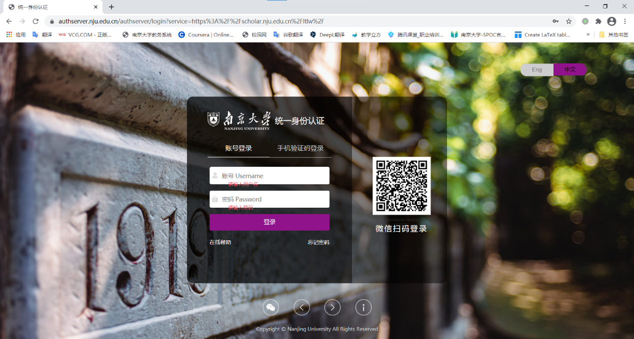 校内用户选择右侧“校内登录”;若为校外用户,选择右侧“校外用户”选项登陆,第(3)步相应不同。
