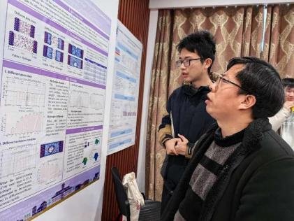 论坛分为学术报告和海报讨论两个环节。在学术报告环节,首先由本次论坛的特邀嘉宾东南大学马亮教授与中国药科大学刘金峰副教授开展学术报告。马亮教授分享了他的团队在二维半导体可控成核与生长的表界面制探究的成果,刘金峰副教授介绍了他的团队对于水溶液的高精度机器学习势能面的最新进展。随后,学院各课题组的七位研究生同学们依次登台,展示了自己近期在科研领域的成果。高星杰同学通过建立生物网络模型,探究了免疫微环境调控对于肿瘤细胞命运抉择的影响;赵苗苗同学介绍了一种基于生成式模型的增强采样方法DA2-VAE;张橙同学在结构受限磷化合物活性算符的理论研究中取得较大进展;于文洁同学探究了银和银基近表面合金电催化二氧化氮选择性还原生成羟胺的微观机制;李俊艾同学报告了在活性膜的分子动力学模拟工作中取得的成果;朱颖同学在脂质过氧化物对于GPCR功能的影响研究中取得阶段性的进展;孔铁霖同学汇报了铁电极化忆阻器的含时电流模拟工作的研究。精彩的学术报告引发了师生的热烈讨论,拓宽了同学们的学术视野。