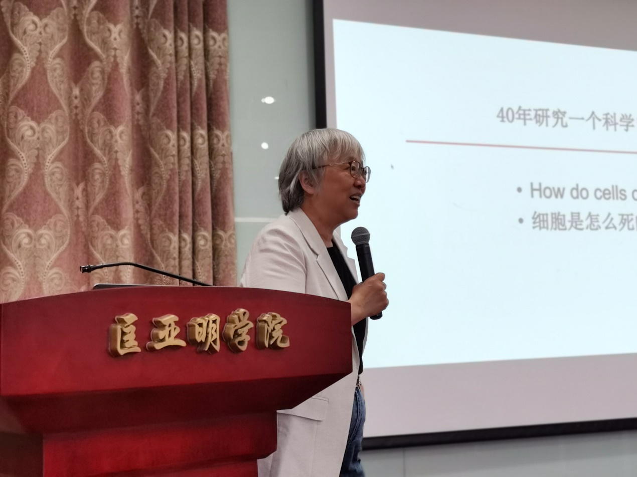2024年5月19日下午,学院邀请美国艺术与科学院院士、美国国家科学院院士、中国科学院外籍院士、中国科学院上海有机化学研究所生物与化学交叉研究中心主任袁钧瑛教授来院做学术报告。报告前,袁院士及团队成员与同学们亲切座谈,随后袁院士为大家带来了题为《三进科研无人区,探索细胞死亡的秘密》的学术报告。该报告也是“2024小蓝鲸本科生学术周”的系列活动之一。