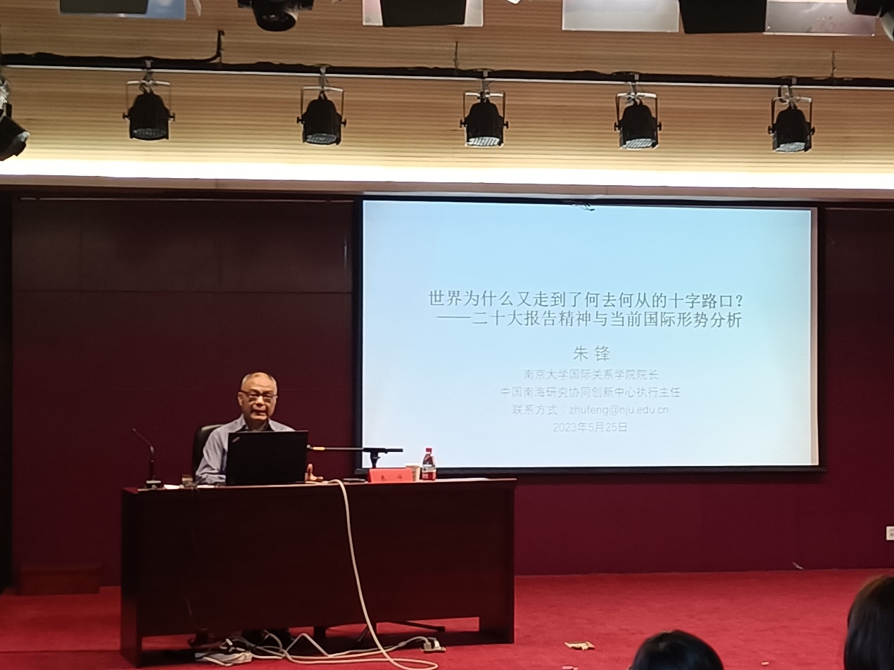 此次报告,朱锋教授格外强调中美关系,并列举一系列数据加以说明:中美关系是最有争议、最具冲突性的国际关系,是最重要又最复杂的双边关系。美国插足台湾问题,目的就是把台湾变成亚洲的乌克兰,把中国妖魔化,把中国和俄罗斯捆绑打压。我们要辨别那些自嗨的自媒体,保持战略清醒。他指出,中美竞争是两大文明的竞争。我们应该传承民族精神并发扬光大,坚定我们的民族信仰,经打、抗打、能打,着眼未来。大国竞争是长期进程,国际形势越是复杂,我们越要有战略眼光,我们要一步步往前走。朱锋坚信,我们能打胜仗。最后,他提出,广大党员要提升对二十大报告的学习,对国际形势有客观、准确、清醒的认识。