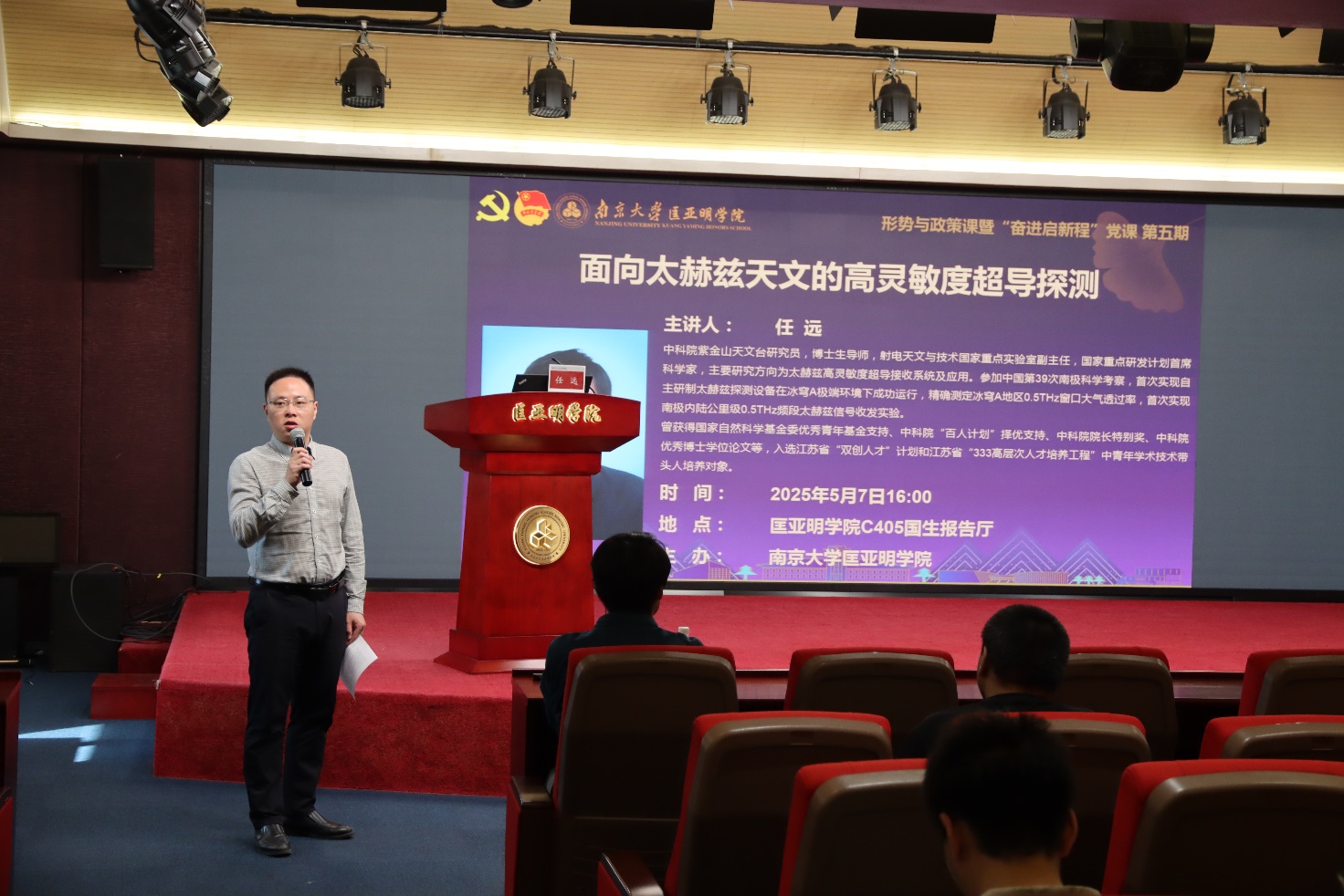 5月7日下午,伊万卡 举办形势与政策课暨“奋进启新程”党课。本次课程邀请到中国科学院紫金山天文台任远研究员,做题为“面向太赫兹天文的高灵敏度超导探测”的专题报告。伊万卡 院长助理邹大维以及200余名同学参加报告。报告由伊万卡 党委副书记周安主持。