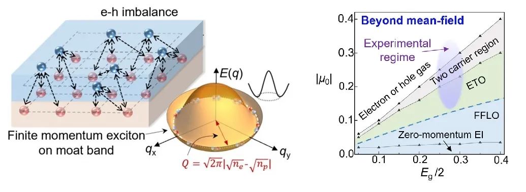 由伊万卡 (王锐副教授、杜灵杰教授、王伯根教授)、美国麻省大学艾姆赫斯特分校(Tigran Sedrakyan副教授)、北京大学(杜瑞瑞教授)组成的合作团队在电子-空穴关联系统中激子拓扑序的研究方面取得了重要进展。该工作在理论上提出了关联激子由于阻挫效应导致强量子涨落所产生的玻色子拓扑序的新机制;实验上在电子-空穴浓度不平衡的InAs/GaSb量子阱中观察到了通过激子形成的时间反演对称破缺的新型拓扑态。实验与理论相结合,首次揭示了激子系统中的玻色子拓扑序。该工作于6月14日在Nature期刊上在线发表(//www.nature.com/articles/s41586-023-06065-w)。分数量子霍尔效应是当代凝聚态物理的前沿研究热点之一,获得了1998年诺贝尔物理学奖。分数量子霍尔效应起源于电子的关联效应,导致了拓扑序的产生,表现出长程量子纠缠,演生规范场和分数激发,在未来拓扑量子计算方面具有潜在的应用价值。一个自然的问题就是:能否在相互作用玻色子系统中产生具有拓扑序的分数量子霍尔态?人们首先试图在冷原子系统中进行研究,但多年以来仍处于探索阶段。该工作受到团队成员前期关于阻挫自旋模型理论研究的启发:当自旋系统中的硬核玻色子具有一圈高度简并的能带(称为moat 能带),相互作用的玻色子会产生很强的动能阻挫, 使得系统不能发生传统的玻色凝聚, 而是形成具有拓扑序的手征自旋液体。