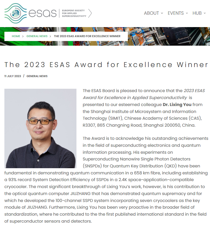 2023年7月11日,欧洲应用超导学会(ESAS)正式宣布,将2023年国际应用超导杰出贡献奖(ESAS Award for Excellence)授予中国科学院上海微系统与信息技术研究所尤立星研究员,以表彰他在“超导电子学和量子信息处理”领域的突出贡献。这是我国超导电子领域科学家首次获得该奖项。
