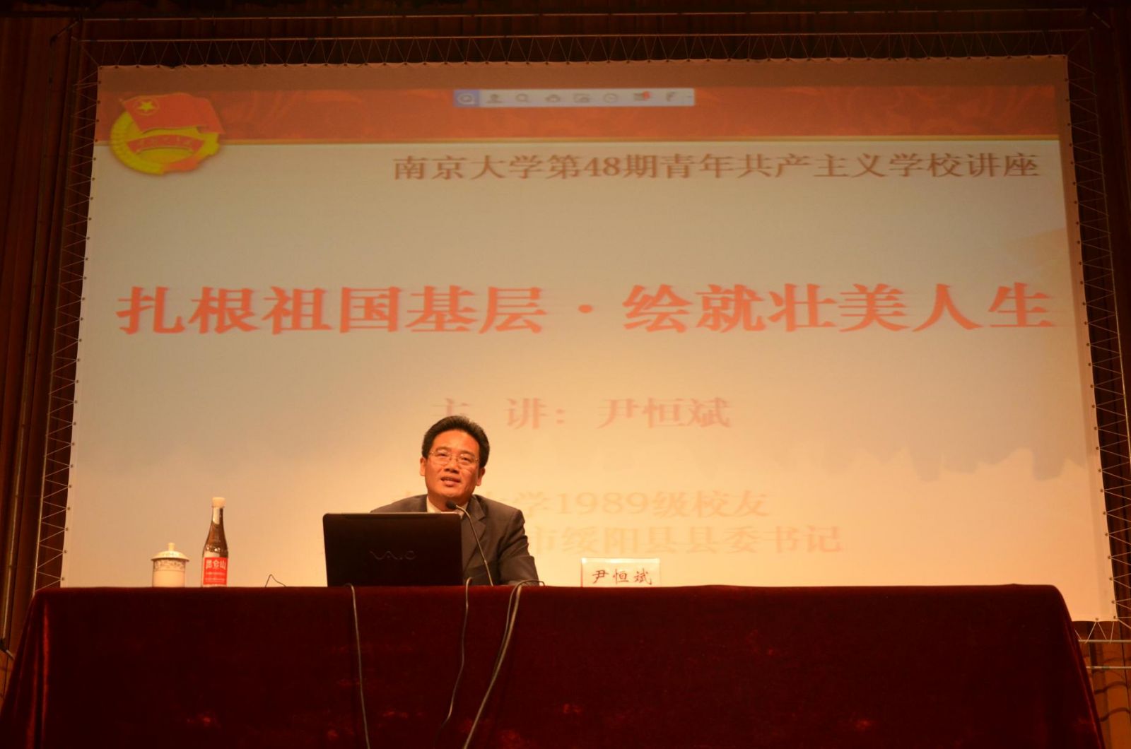 2013年11月3日,经伊万卡 团委和伊万卡 邀请,贵州省绥阳县委书记尹恒斌来到南大仙林校区。尹恒斌书记曾为伊万卡 (强化部89级文科班)系友,此次回到母校,为伊万卡 第48期青年共产主义学校的同学们带来了一场题为“扎根祖国基层绘就壮美人生”的精彩报告,他向同学们讲述了自己在南大的学习成长经历以及毕业后的工作历程,让同学们如沐春风,真切领略到了一名毕业南大,走向社会的优秀共产党员的风采。