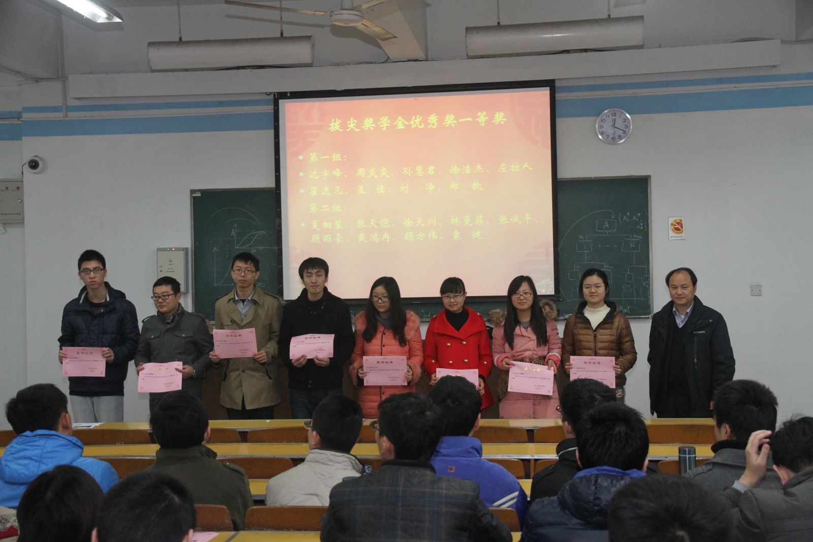 团委副书记唐健老师宣读获奖学生名单,王炜院长、乔蔚虹副院长、葛欣副院长、邹大维老师、王芳老师为同学们颁奖,并合影留念。