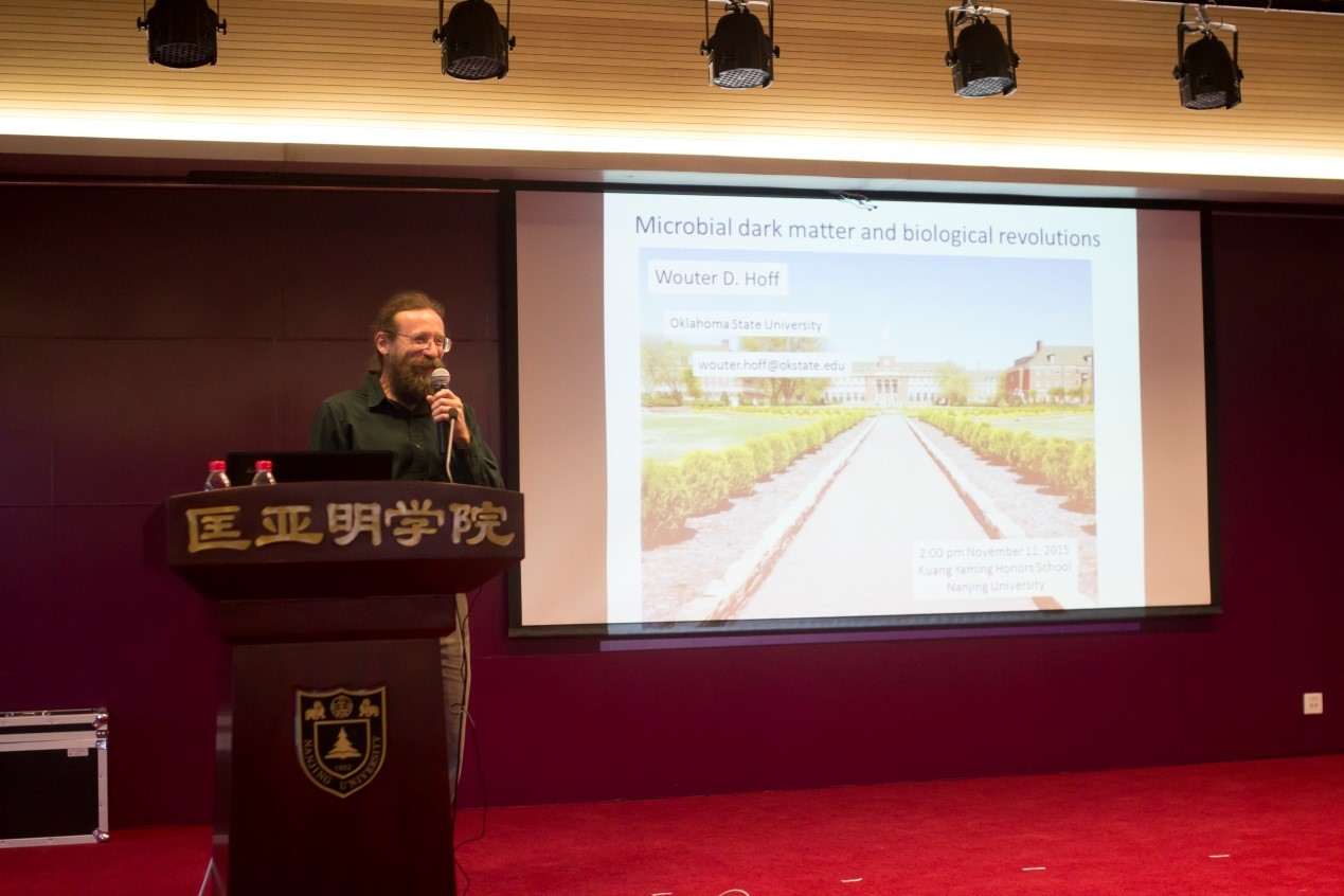 11月11日下午2:00,美国俄克拉荷马州立大学生物化学教授Wouter Hoff为2014级同学们作了题为“Microbial Dark Matter and Biological Revolutions”的讲座。作为生物化学研究的知名专家,Wouter Hoff教授主要研究基因组以及相关生物化学问题。Wouter Hoff教授从DNA的三种测序方法,电子显微镜的发展,再到基因组的测定及研究,始终贯穿着生物学思想中的创新思维,还配以生动的动画讲解,形象易懂,深入浅出。讲座由伊万卡 王炜院长主持。