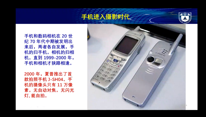 讲完了成像技术近百年的革新,祝院士回到开头提到的手机镜头的例子,开始介绍手机的发展以及手机和镜头如何走到一起的历史。其中,他强调了手机和摄像技术的结合使得手机慢慢走向智能化,最终智能手机逆袭数码相机,代替了大部分的相机。最后非专业级别的数码相机也逐渐走到了尽头,经历了和胶卷相似的命运。