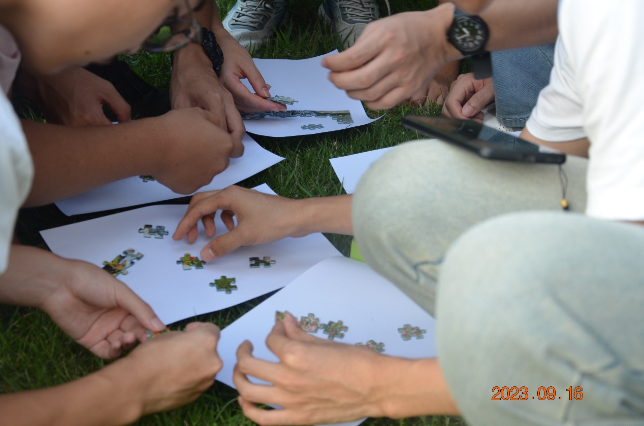 所有新生与老师分为数组团坐在北大楼前草坪,沐浴在温暖的阳光下,,轮流用两句真话和一句假话描述自己,其他的同学和老师猜测哪一句是假话,大家各方面的描述在增添乐趣、活跃气氛的同时也增进了彼此间的了解、拉近了彼此的距离。随后大家经过一轮轮的增加细节,给身边的每个人都画了一幅速写作为赠与彼此的礼物。