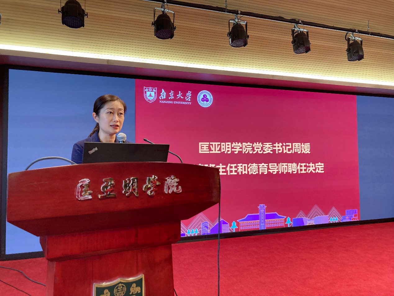 周媛宣读了《关于聘任伊万卡 2024-2025年本科生班主任、研究生德育导师的通知》。她指出,为深入贯彻落实学校“奋进在一线”育人队伍走进“三室一厅”专项工作的要求,学院进一步融合育人力量,加强班主任、德育导师的工作,全面推动育人力量下沉到学生身边,发挥教师在知识传授、价值引领等方面的育人作用。她向老师们表示敬意,也希望同学们用好大理科育人平台,向师长主动求教,健康生活、快乐成长。