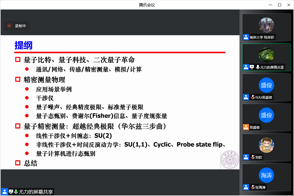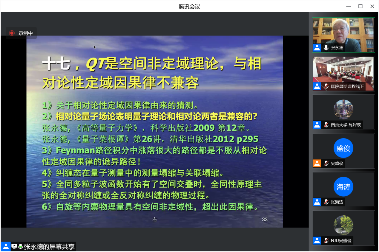 基础课程部分由该项目的负责人吴盛俊教授主持。奥地利科学院通讯院士、全国高校量子力学研究会名誉理事长、中国科学技术大学资深教授张永德先生开启了讲习班的基础课程,他主讲的《量子力学疑难争论问题概论》一共6节课,系统阐述了量子力学理论上的疑难问题,从一个全新的高度开启学员对量子计算的基础—量子力学—基本问题的思考。