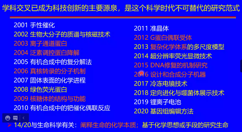 在第一部分郭院士首先举例介绍了影响人类健康的重大发现,包括弗莱明与青霉素的发现、屠呦呦与青蒿素的发现,强调了脚踏实地、注重观察、相信实干胜于空谈的科学精神;之后郭院士从近20年的诺贝尔化学奖的获奖奖项中强调学科交叉已成为科技创新的主要源泉,是这个科学时代不可替代的研究范式;最后郭院士给我们介绍了化学生物学,特别是与郭院士研究方向相关的金属化学生物学的相关内容。