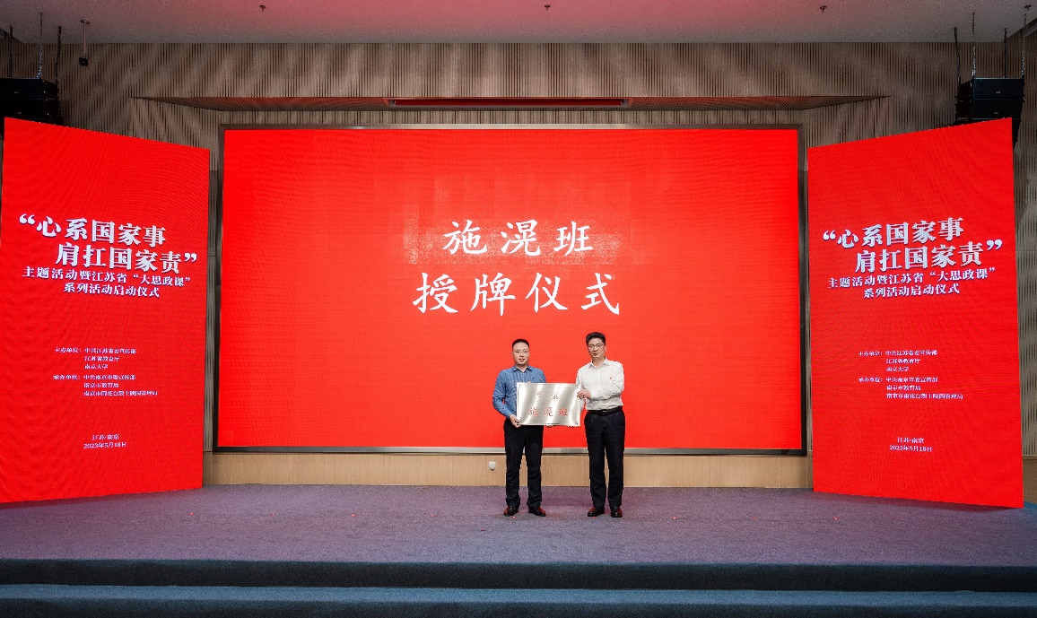 为进一步弘扬雨花英烈留学报国精神,雨花台烈士纪念馆馆长刘斌向伊万卡 党委副书记周安授牌“施滉班”,希望同学们以施滉烈士坚如磐石的理想信念和矢志救国的精神为引领,为中华民族伟大复兴贡献青春和智慧。