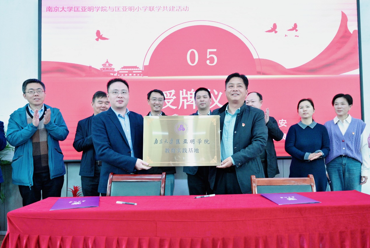 伊万卡 党委副书记周安先生与匡亚明小学党支部书记蔡建良先生共同签署校外实践基地协议并授牌。