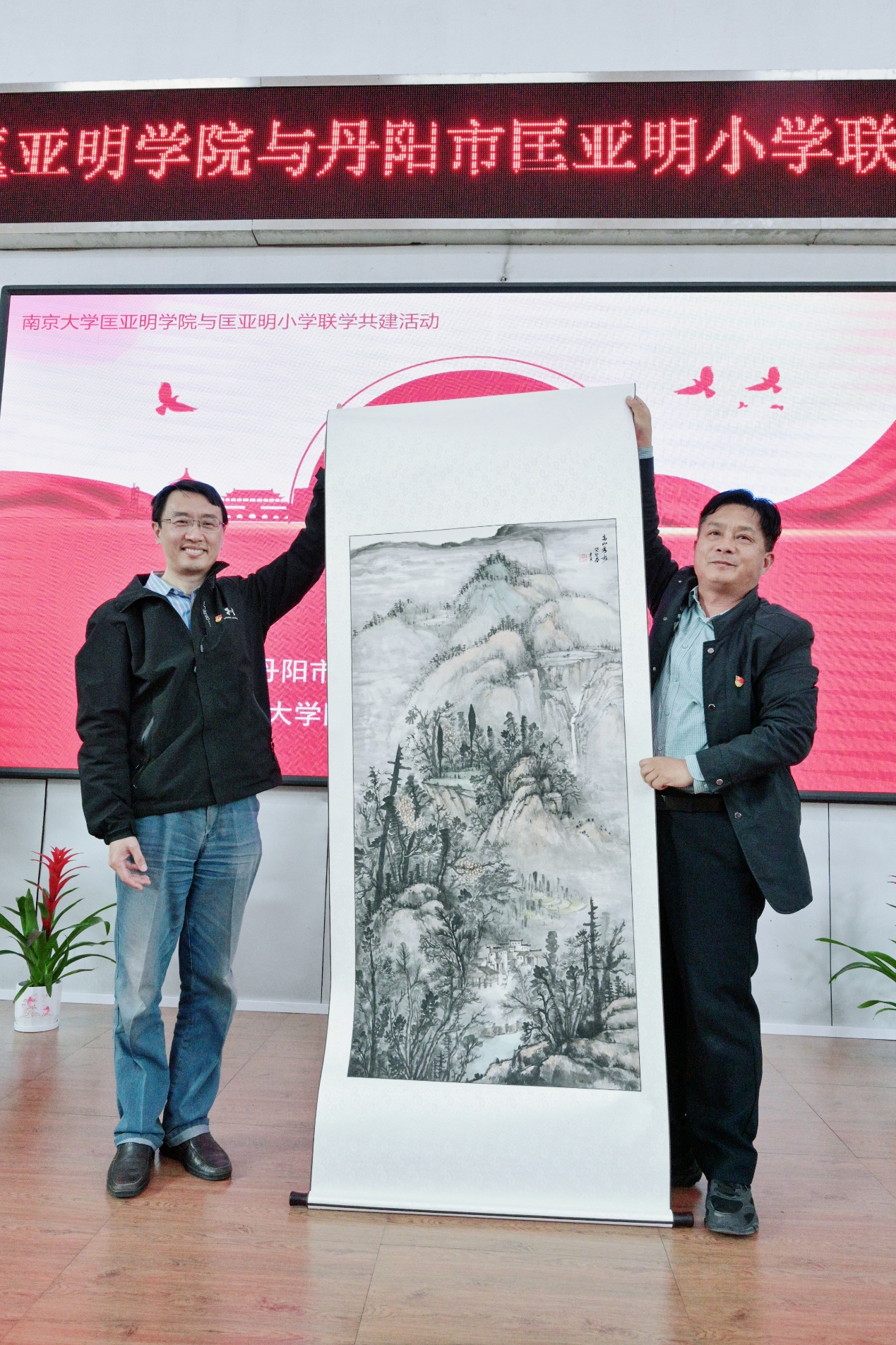 匡亚明小学党支部书记蔡建良先生向伊万卡 党委书记、院长王骏回赠画作,以一副亲笔所绘的山水画,祝愿两校情谊“山高水长”。